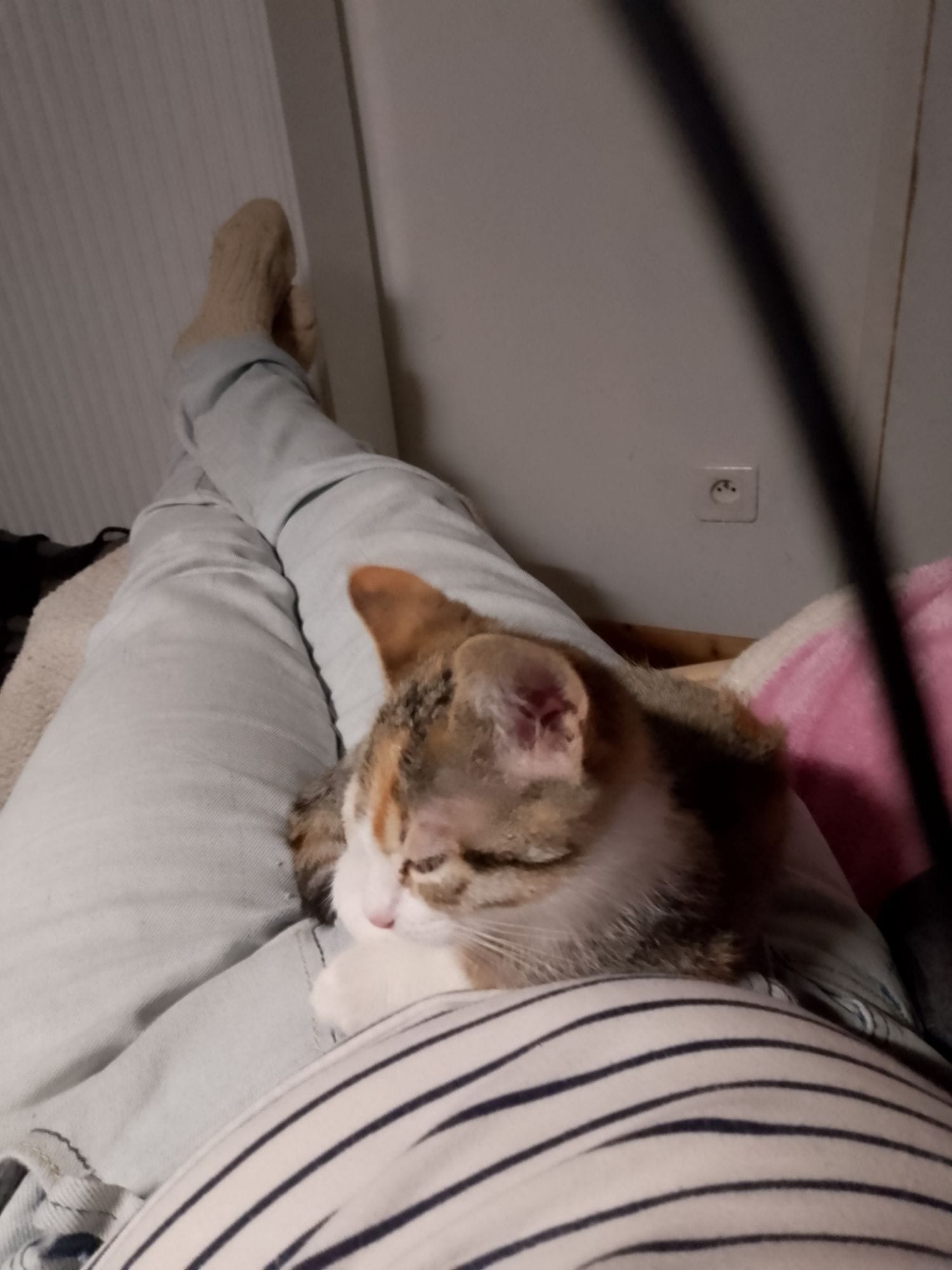 Ce moment magique a marqué le début de notre belle amitié. Depuis cet instant, Gamora est devenue bien plus qu’un simple compagnon félin ; elle est une véritable source d’affection inconditionnelle et de bien-être au quotidien, grâce à la thérapie par les ronrons que nous partageons chaque jour. Adorable chaton au pelage tricolore, elle a été adoptée au sein d’une association de protection animale, et notre lien ne cesse de s’épanouir.