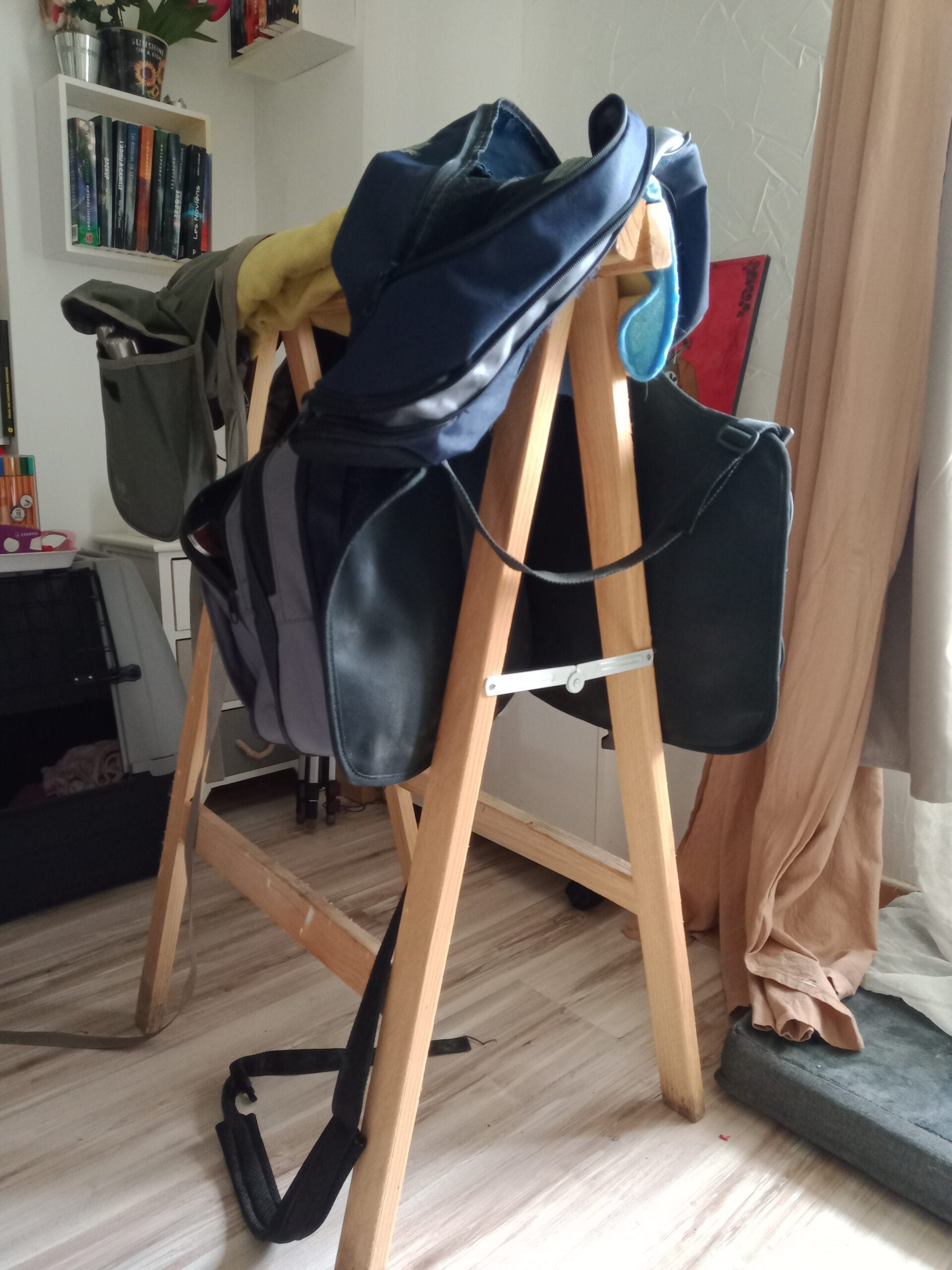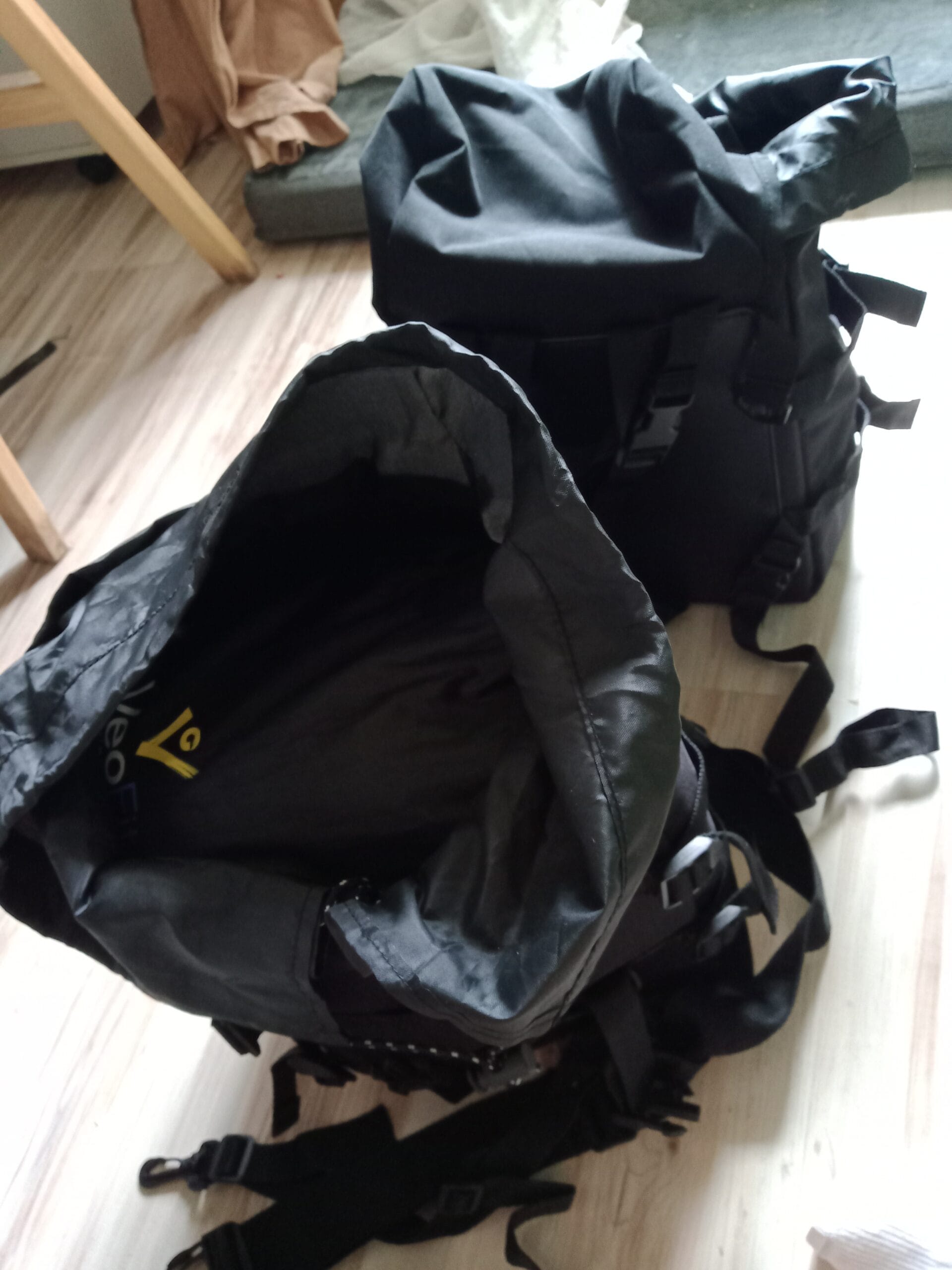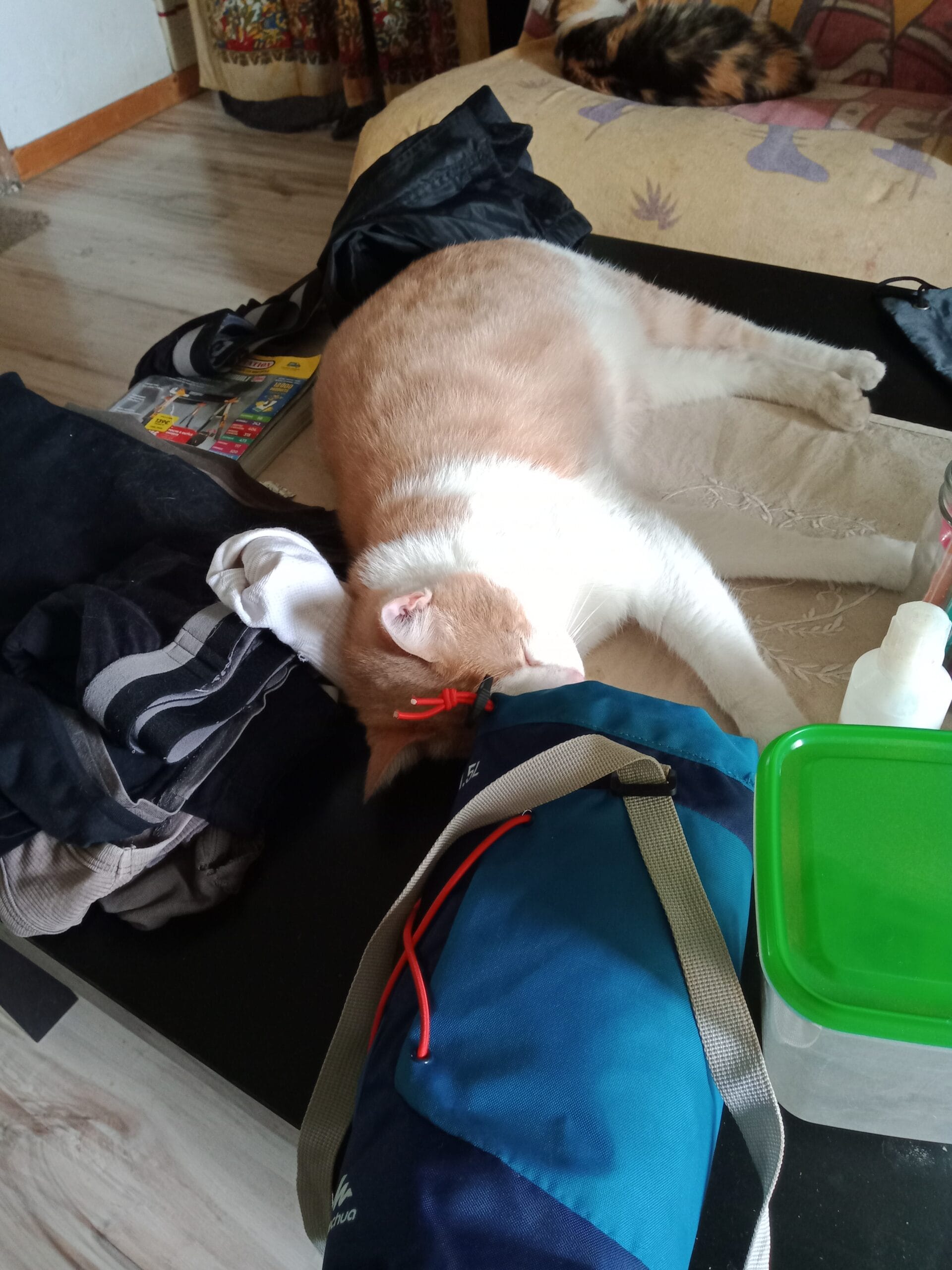 La dernière balade itinérante d’entrainement fut rock’n roll. Le matériel inadapté et mal fixé m’a fait réfléchir aux diverses solutions. J’ai donc acheté des grandes sacoches et tout étalé sur la table. Je voulais tester le matos et on verra à l’usage mais ce nouveau matériel se charge comme un sac de randonnée pédestre. Je n’en avais pas pris pour Gaya, on va faire sans cette fois : soyons minimalistes, c’est l’été et cette fois, nous faisons étape chaque soir chez un paysan local qui pourra nous approvisionner en eau (et en yaourt/fromage).