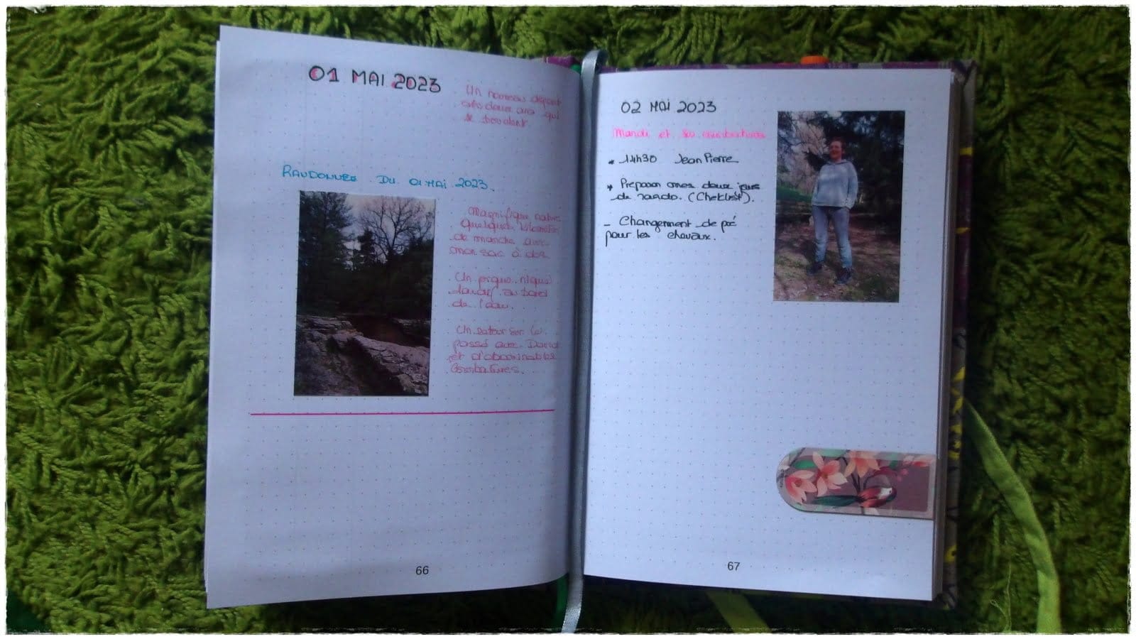 Une première page très simple avec une photo qui fait fonction de prise de conscience et un planning sur la page de droite. Pour mon anniversaire, je prépare deux jours de randonnée avec les chevaux et un bivouac – ce sera la première fois que je me pose la nuit avec eux au milieu des bois.