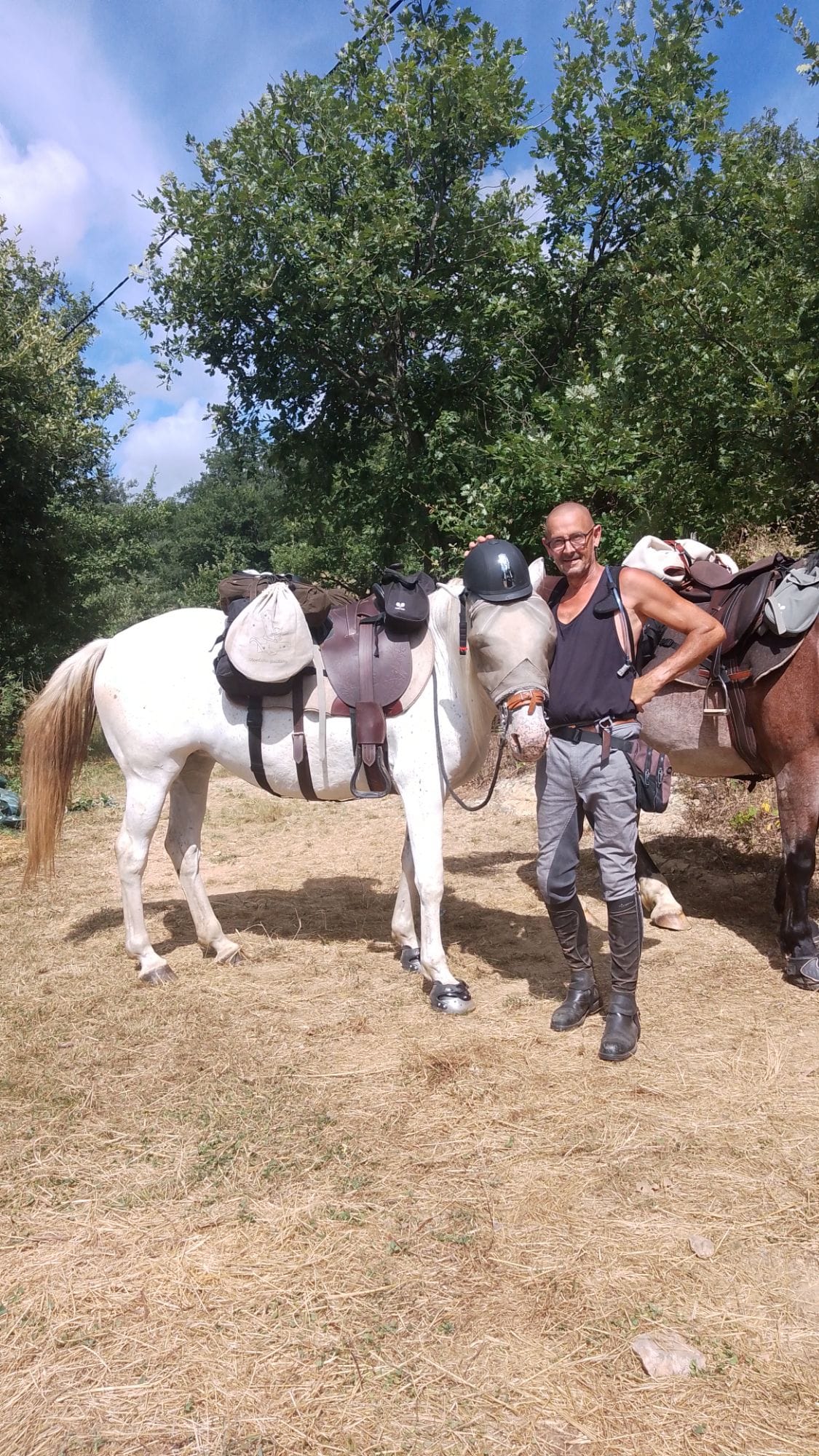 Il est vrai que le coup de main se perd vite. Alors, là, je me suis mis à jongler avec les sangles et les mousquetons comme un clown sous un chapiteau, en bavardant avec mes chevaux comme s’ils me comprenaient (qui sait, après tout ?). Et ben voilà, après plusieurs essais et un léger embarras—parce que, avouons-le, l’élastique du pantalon peut parfois jouer de mauvais tours—nous étions enfin prêts à partir.